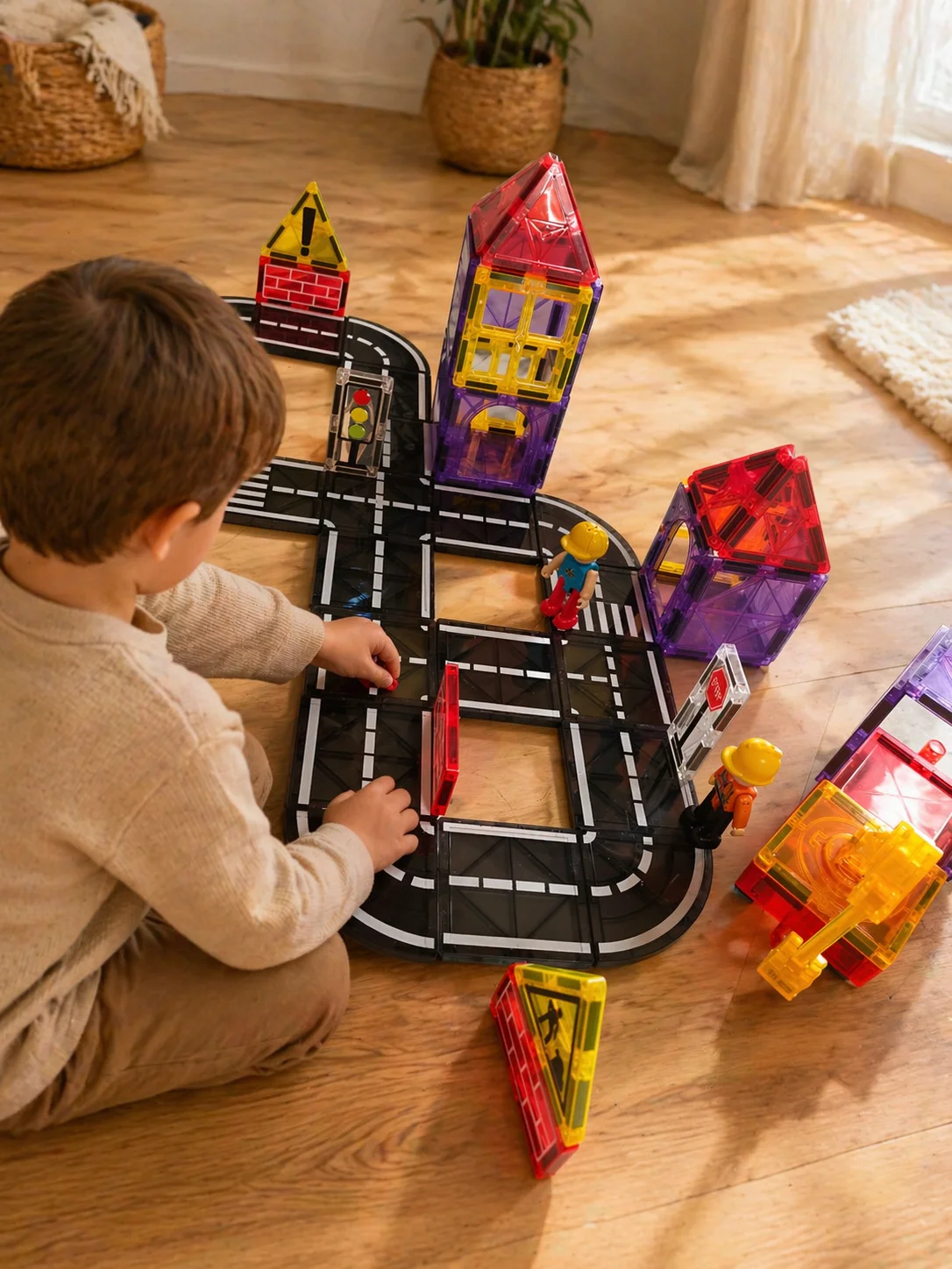 Magnetne ploščice, ki sprožijo domišljijo. Ceste, mesta, stavbe — vsak dan drugače.